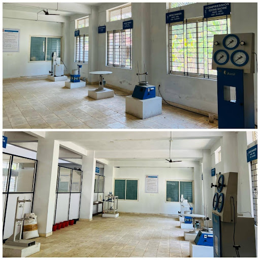 The Material Testing Laboratory at our institution is well-equipped with a wide range of tools and apparatus essential for conducting comprehensive assessments of the properties and performance of various construction materials. Key equipment includes the Flow Table, Sieve Shaker, Compression Testing Machine, Vicat Apparatus, Compaction Test Apparatus, Density Basket, Rebound Hammer, Slump Test Apparatus, Le-Chatelier Apparatus, Le-Chatelier Flask, Tile Testing Machine, Flexural Strength Testing Machine, and Vee Bee Consistometer. These facilities enable the laboratory to perform a variety of tests to evaluate the characteristics of materials such as concrete, tiles, and more. In addition to academic and research activities, the lab is also engaged in consultancy services, offering reliable insights and recommendations to clients based on test results.